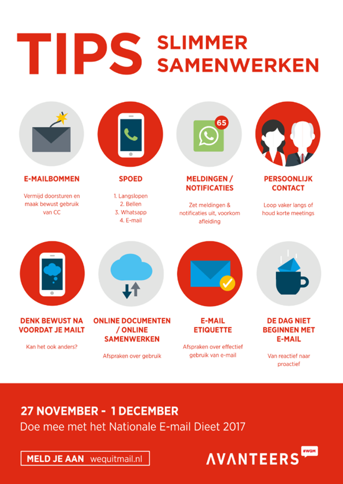Het nationale e-mail dieet wordt dit jaar gehouden van 27 november tot en met 1 december. Deze week is een initiatief van Kim Spinder, auteur van We quit mail. Je leert hoe je tijdens je werk minder druk kunt zijn met e-mail, hoe je de helft minder e-mails ontvangt en hoe samenwerken met collega’s weer leuk wordt. Al 7412 Nederlandse professionals hebben meegedaan met het e-maildieet.