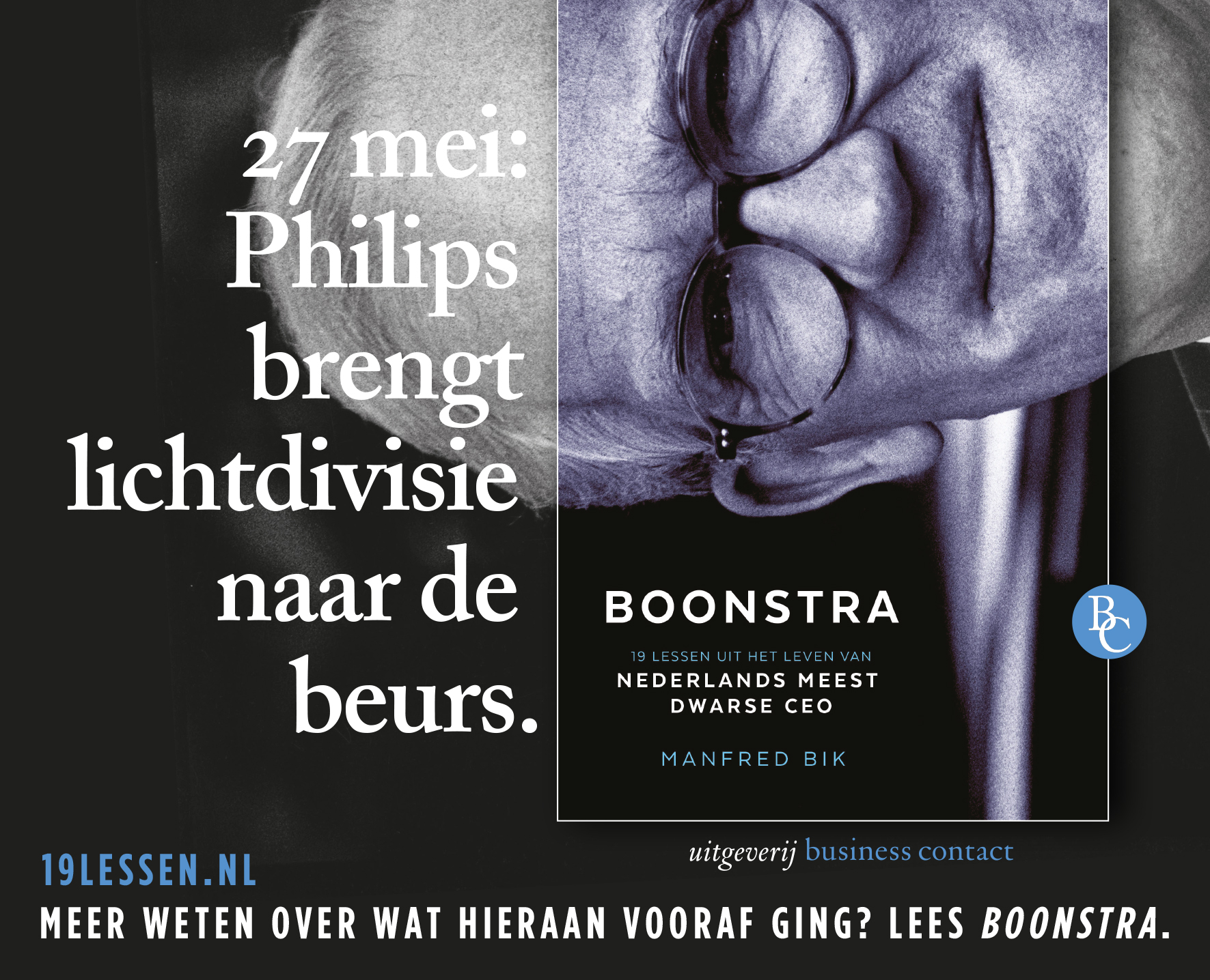 Vandaag, vrijdag 27 mei, is een historische dag. Philips, het bedrijf dat 125 jaar geleden begon met het produceren van gloeilampen, brengt haar lichtdivisie naar de beurs. De komende jaren zal het zich zelfs helemaal terugtrekken als eigenaar. In het recent verschenen boek Boonstra valt te lezen dat Cor Boonstra degene was waar dit allemaal mee begonnen is.