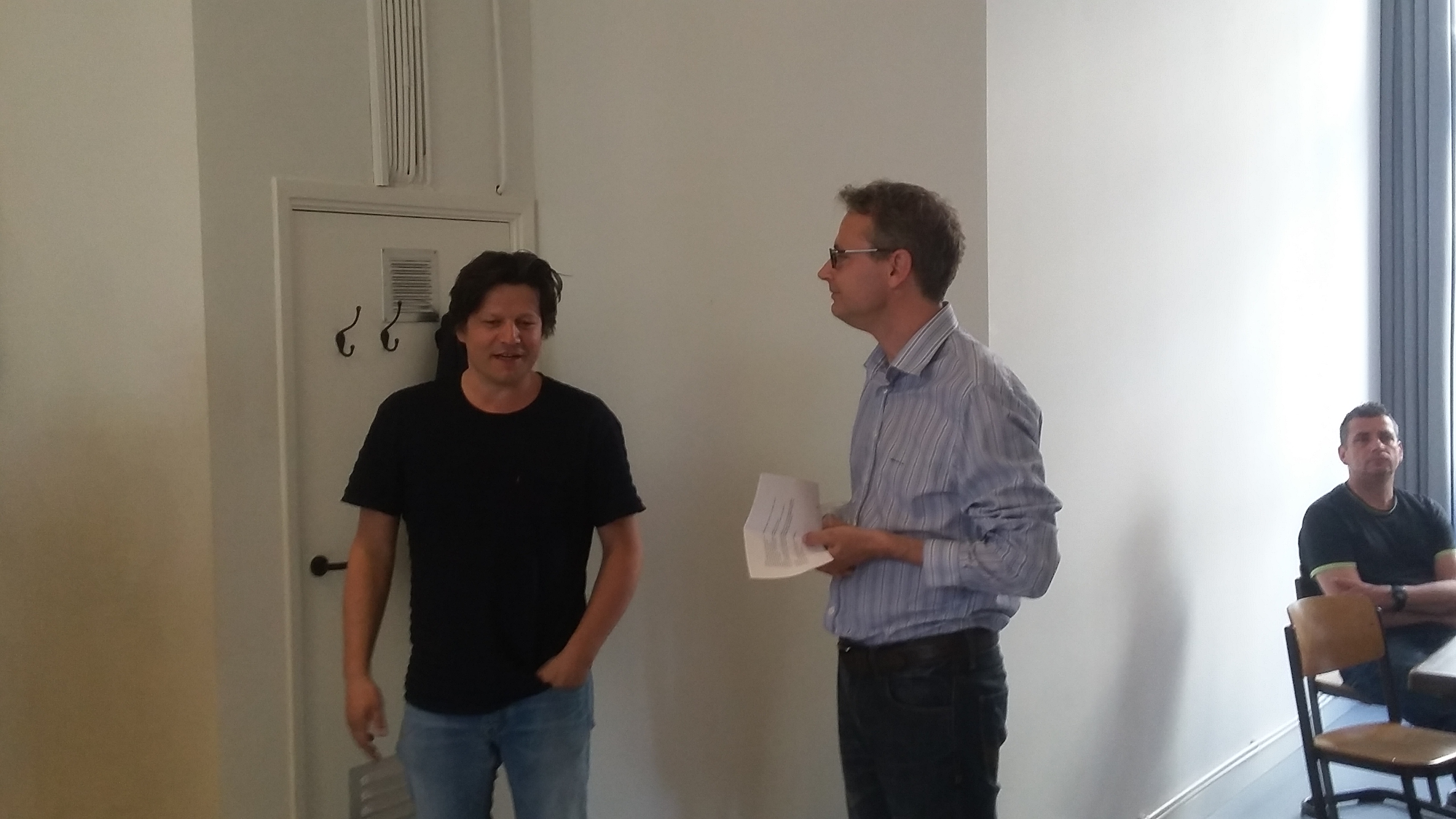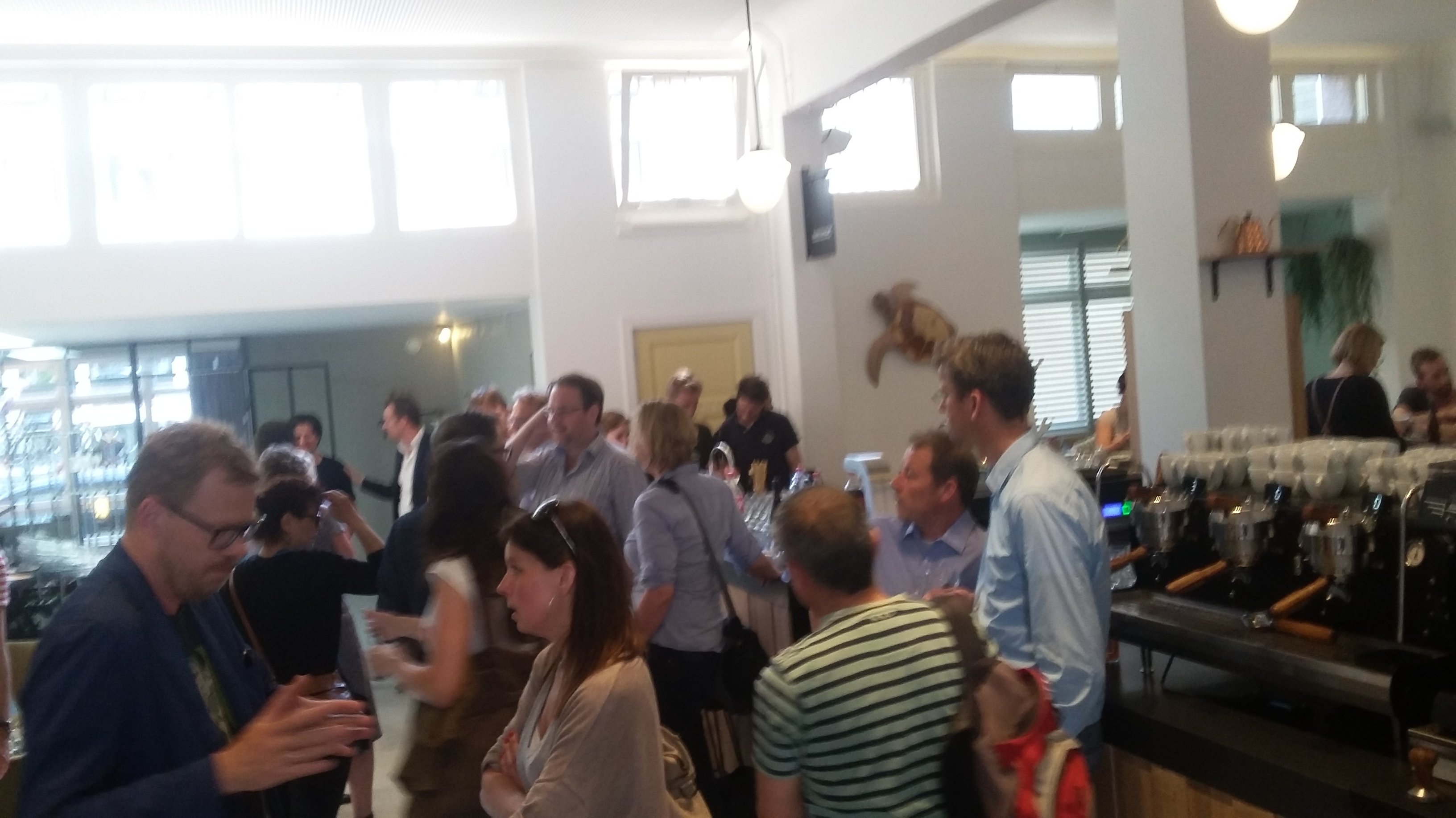 Donderdagavond was de boekpresentatie bij Bocca Coffee, het proeflokaal van de nieuwe Nederlandse koffiepioniers Menno en Tewis Simons (laatstgenoemde staat links op de foto). Ook andere koffiepioniers zoals Dick de Kock, Kees van der Westen en Leigh McDonald, allen ook geïnterviewd voor het boek, waren aanwezig.