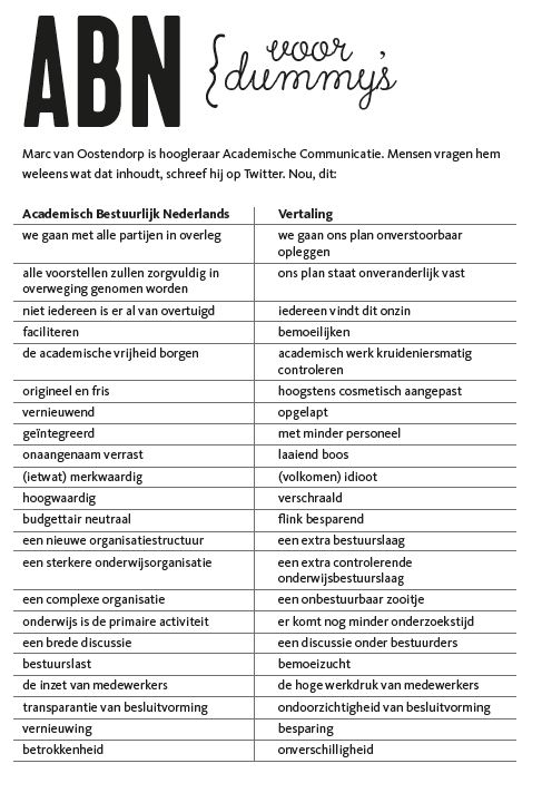 De academische wereld staat niet bepaald bekend om zijn ’transparante’ communicatie. Marc van Oostendorp, hoogleraar Academische Communicatie, geeft in het Vakantieboek voor professionals en managers een overzicht van de meest gebruikte termen en uitdrukking van Academisch Bestuurlijk Nederlands. Herken jij ze of gebruik je ze weleens?