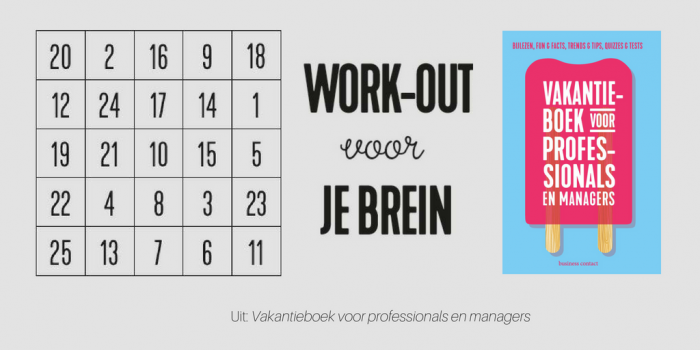 Deze work-out voor je brein is een voorproefje uit het leukste boek van deze zomer: het Vakantieboek voor professionals en managers. Verspreid door het vakantieboek staan negen van deze oefeningen. De work-outs voor je brein zijn afkomstig uit het boek Breinbootcamp van Denis Bukin.